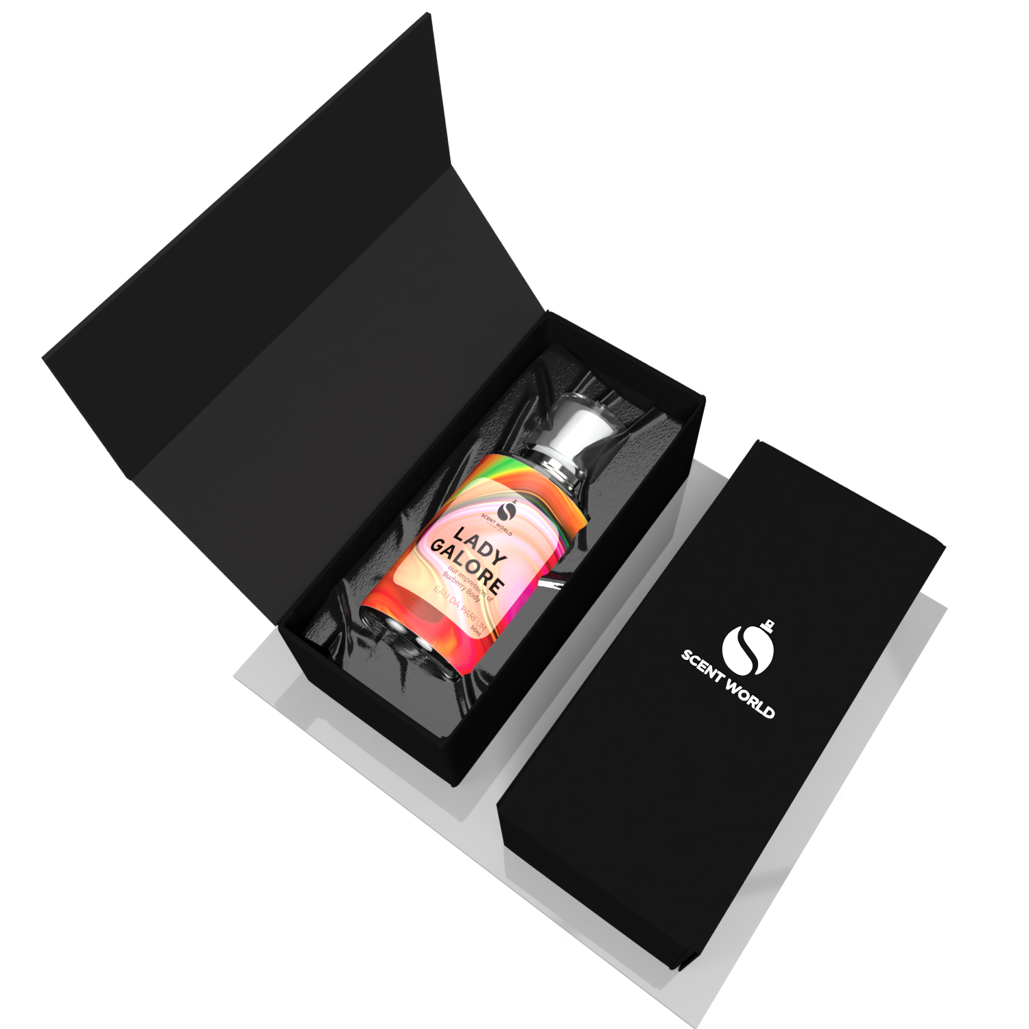 Lady Galore is the scent for those who don't want to be overtaken by their beauty. An effortlessly sensuous, feminine scent with a diverse combination of exquisite components, this fragrance has been carefully crafted to turn heads and make your pulse race. With a foundation of woody cashmeran and musk, the Eau de Parfum has an unusual blend of elegant components, including fresh green absinthe and dazzling peach. Natural rose absolute, iris, and warm sandalwood are present in the floral heart notes, and woody cashmeran, creamy vanilla, amber, and musk are present in the base notes.